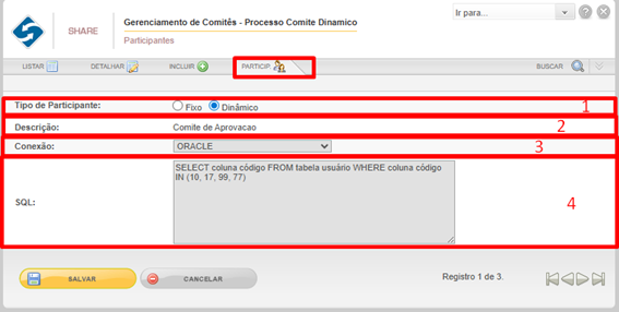 Dinâmico: Administrador deverá configurar os usuários que participarão do comitê selecionado com a opção Dinâmico (Figura abaixo, Passo 2). Para adicionar usuários Participantes do comitê dinâmico, o administrador deverá clicar no dropdown da conexão, como mostrado na figura abaixo no passo 3, e, selecionar o Banco de Dados que deseja conectar. Após a conexão, o administrador deve inserir o código SQL para que esse código possa consultar no Banco de Dados as informações inseridas no SQL (Figura abaixo, Passo 4) e clicar em SALVAR para salvar a conexão e inserção da consulta. Na figura abaixo vemos um exemplo de consulta, onde trará para o comitê os usuários cujos códigos estão dentro dos parênteses “()”.