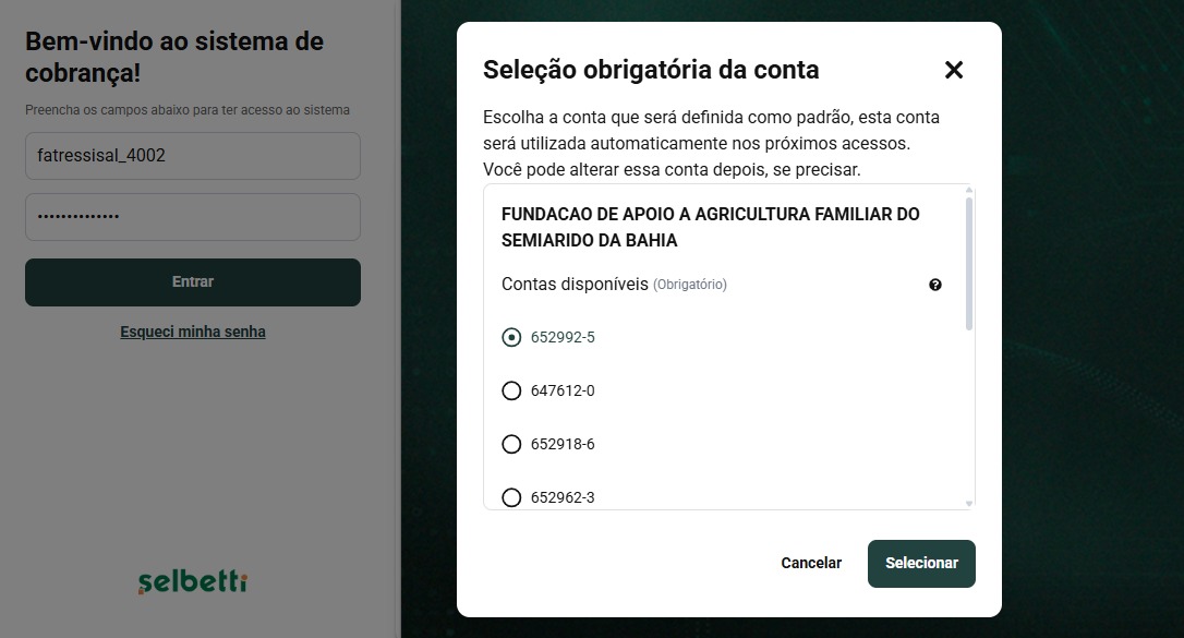 A funcionalidade de Definição de Conta Padrão permite que o usuário escolha qual conta (carteira/beneficiário) será automaticamente carregada ao acessar o sistema.