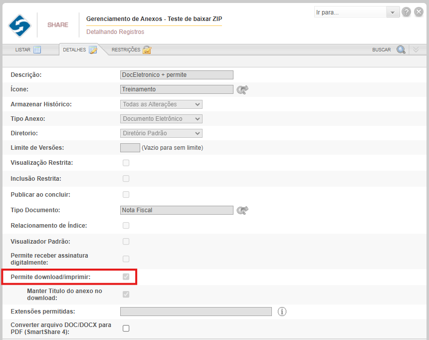 Em casos de múltiplos anexos, somente serão incluídos no arquivo compactado aqueles que estão configurados com a permissão de download.