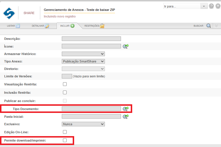 • Deve ser realizada a configuração de permissão download de acordo com o respectivo Tipo do Anexo em Gerenciamento de Anexos: