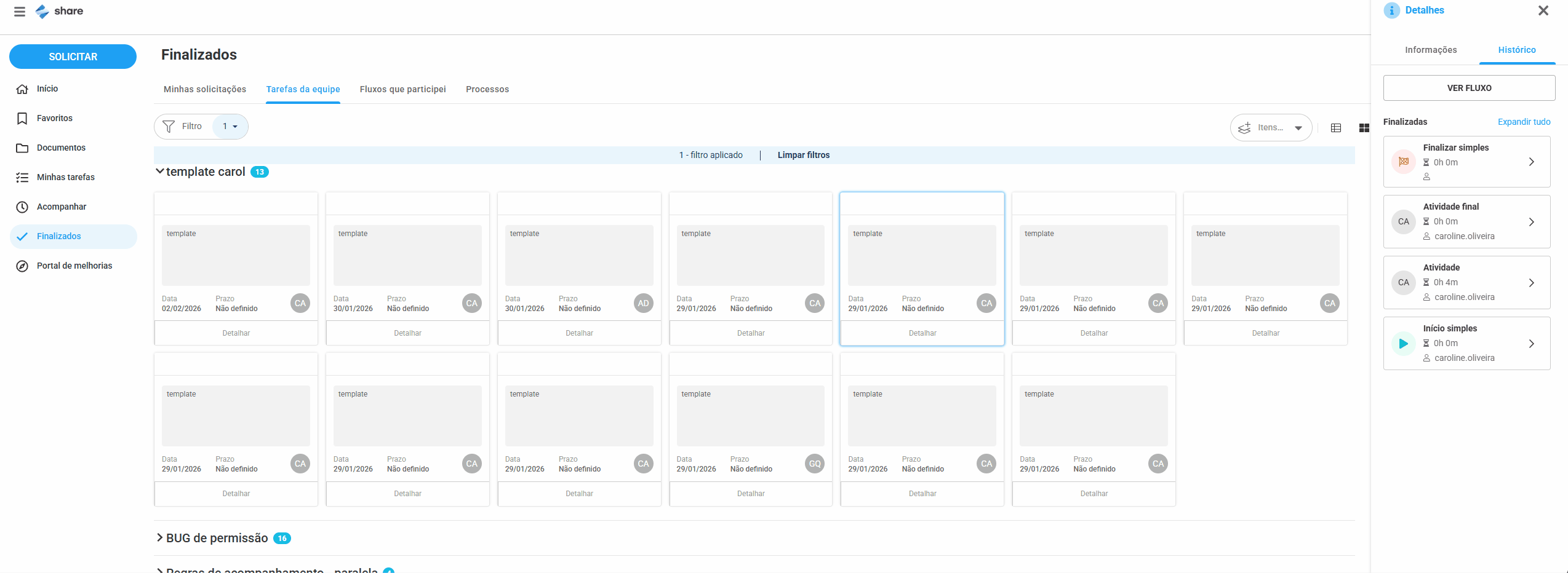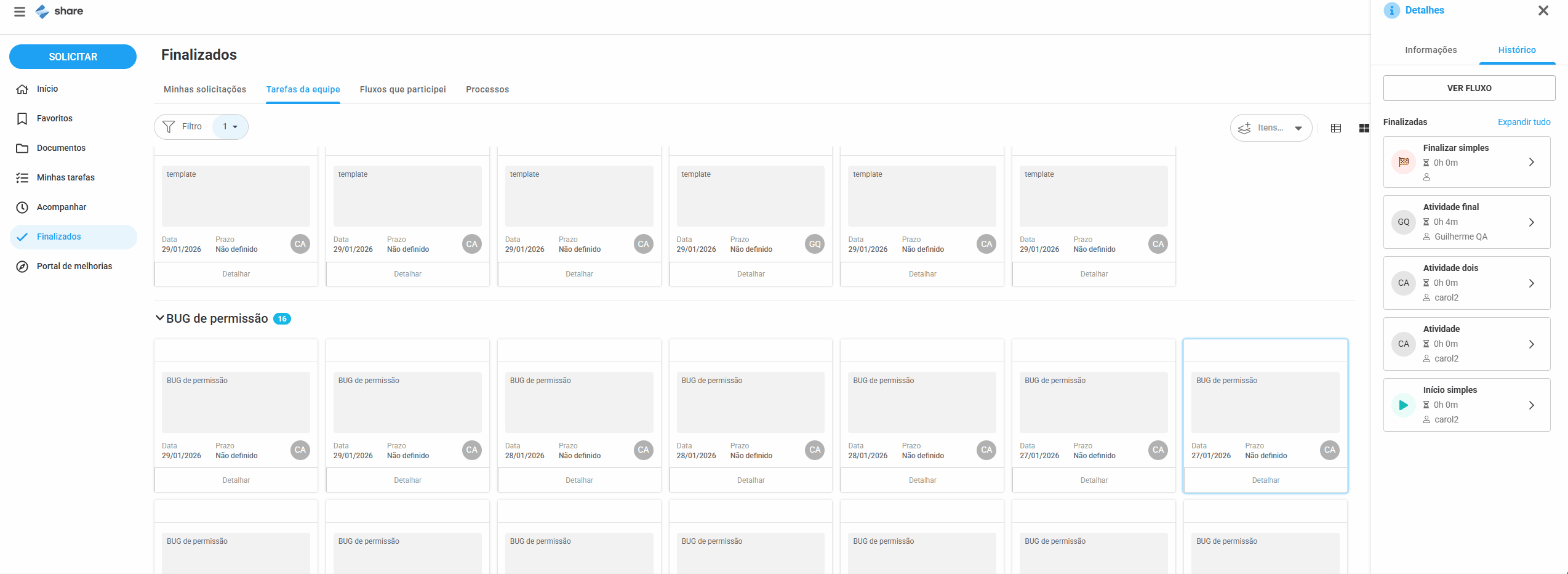 • Caso a última atividade do fluxo esteja configurada com a opção de formulário definida como “Não exibir”, a aba formulário será apresentada na visualização do fluxo finalizado, mas com a mensagem “Tarefa sem formulário”