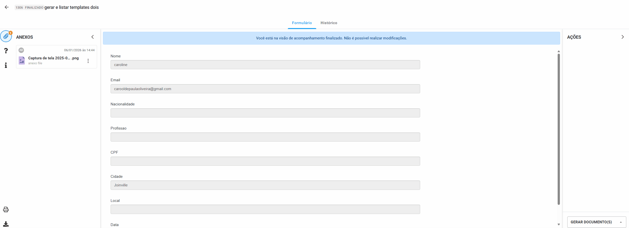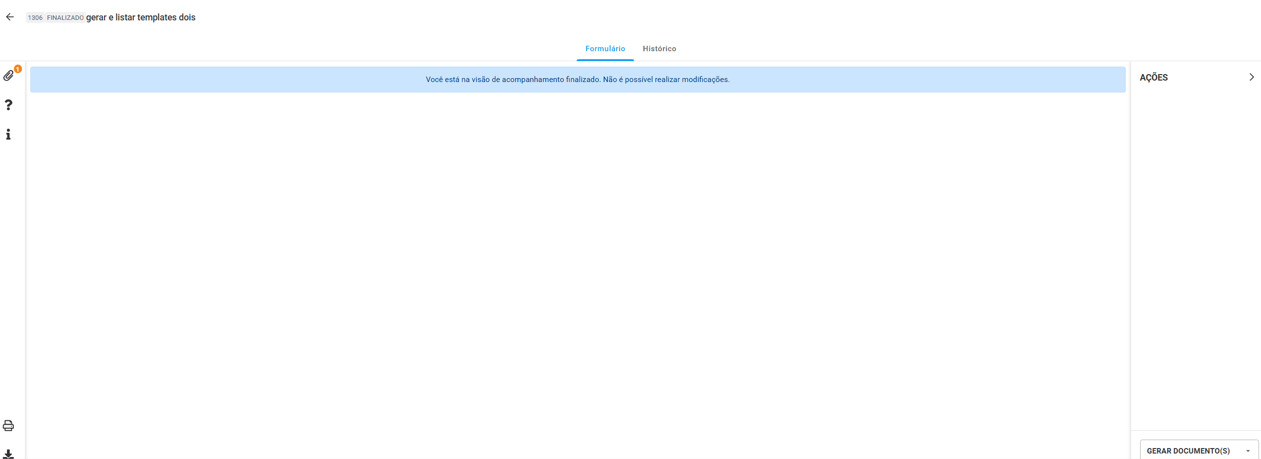 Ao finalizar o fluxo, todos os templates associados ao processo que o usuário logado possui permissão serão listados, exceto aqueles configurados para geração automática ao avançar o fluxo, conforme regras descritas neste documento.