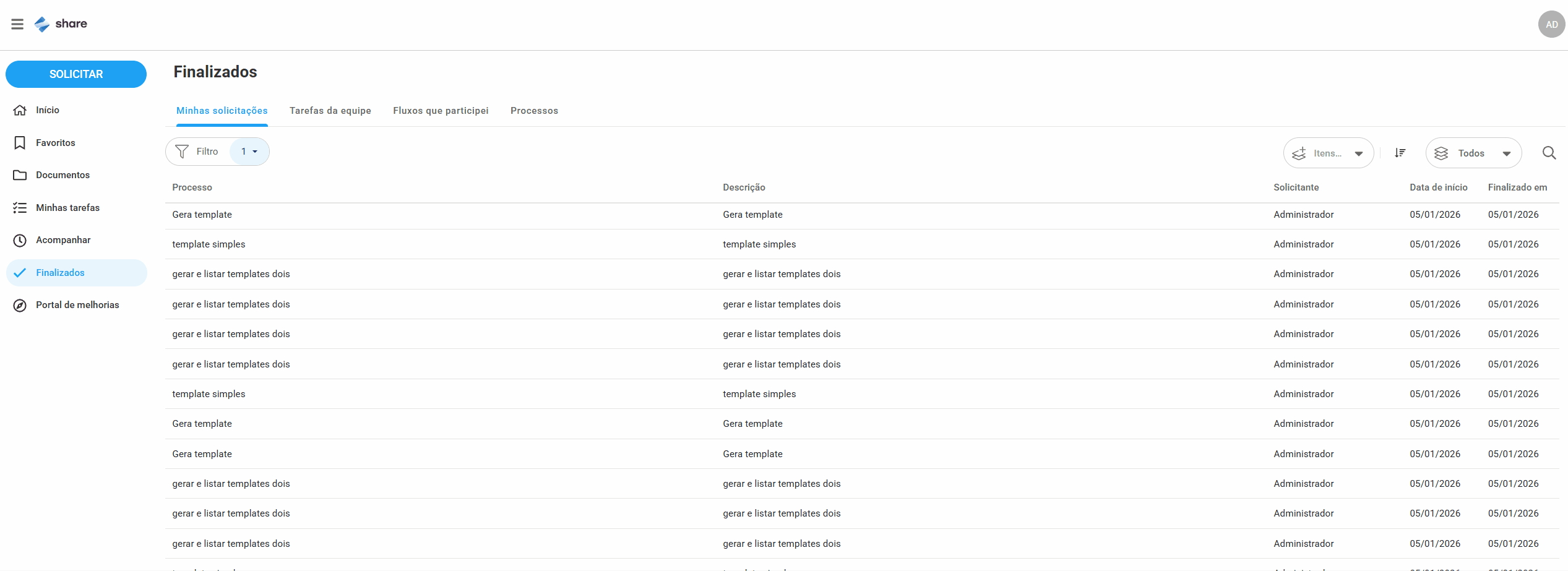 Quando houver templates configurados com a opção “Anexar automaticamente ao fluxo”, definida no Gerenciamento de Templates, esses templates serão exibidos normalmente na listagem após a finalização do fluxo.