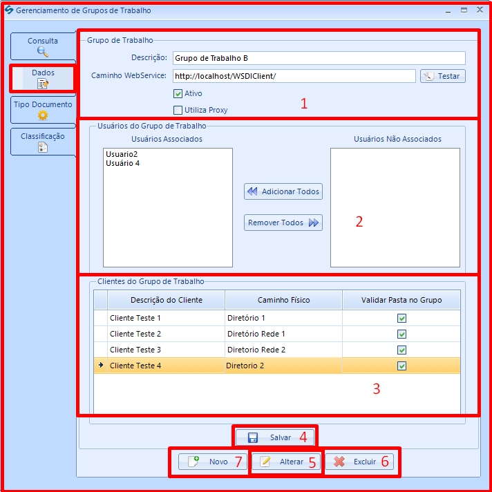 Para alterar informações do registro de algum grupo de documento ou realizar a exclusão do mesmo, é preciso localiza-lo na listagem de grupos, clicar duas vezes sobre o registro para acessar a aba Dados, onde será disponibilizado os botões ALTERAR e EXCLUIR (Figura acima, Passos 5 e 6).