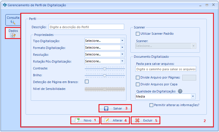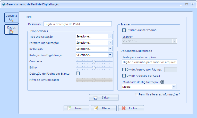 - Permitir Alterar as Informações: Se sinalado, permitirá que durante a digitalização de documentos o usuário vinculado ao perfil que está sendo criado tenha a possibilidade de alterar as configurações da digitalização, do contrário, as propriedades ficarão desabilitadas para o usuário.
