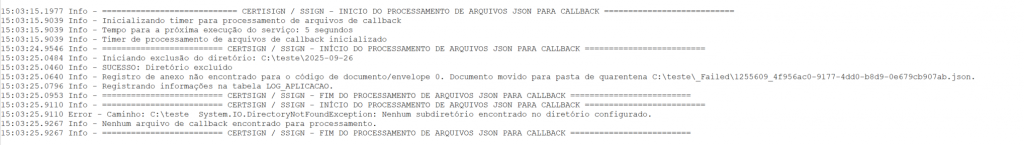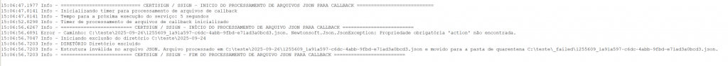 Quando ocorre falha de processamento, o arquivo correspondente é movido automaticamente para a pasta de quarentena (\failed) para análise manual.