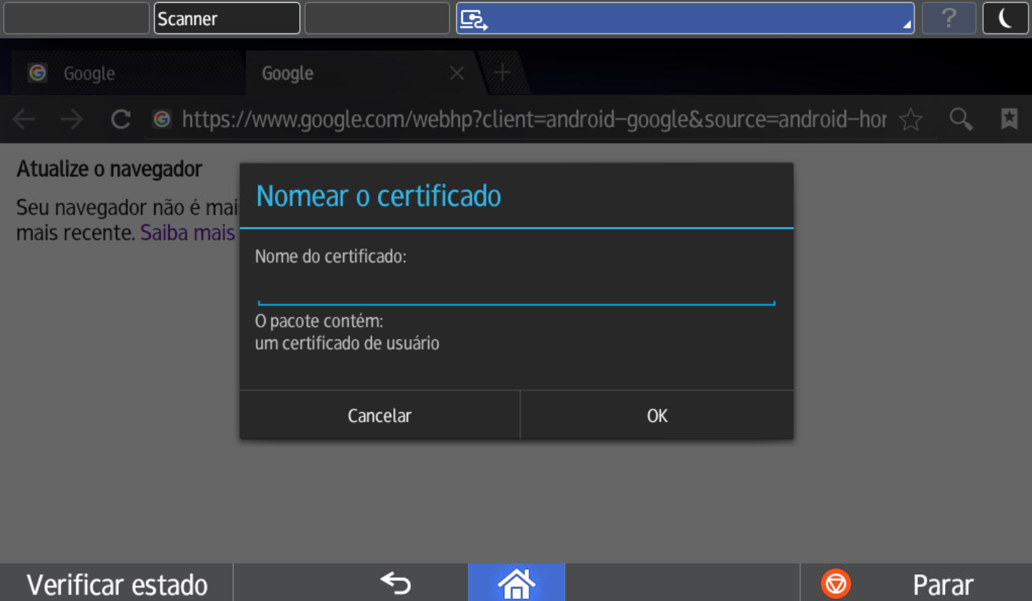 Em alguns modelos de impressora com Smart Operation Panel, ao acessar a URL do certificado diretamente pelo navegador interno, o processo de instalação ocorre automaticamente.