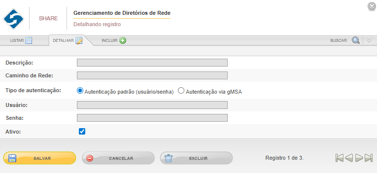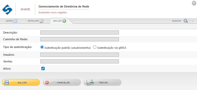 Ativo: se preenchido o checkbox o diretório está ativo e pronto para ser utilizado, caso desmarcado, o diretório de rede estará indisponível para utilização.