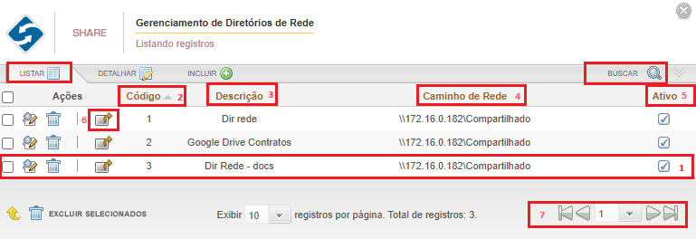 Na aba Listar, o administrador encontrará todos os registros de Diretórios de Rede cadastrados no SmartShare, com suas descrições (Figura abaixo, passo 1). Nesta aba, o administrador poderá definir a ordem que os registros de domínio, estarão dispostos para visualização na tela de gerenciamento, podendo ser por: