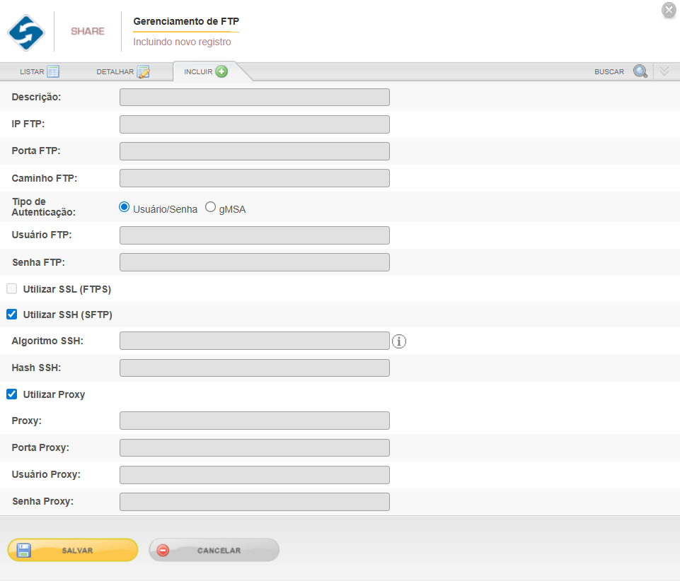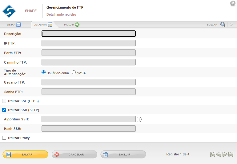 Na aba Detalhar, o administrador encontrará todas as informações sobre o FTP selecionado, permitindo a edição do registro. Se alguma alteração for realizada, o administrador deverá confirmar a mesma, clicando em SALVAR.